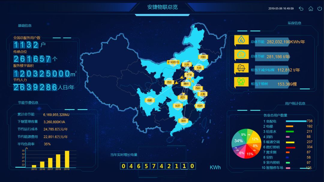 suncitygroup太阳集团能够将建筑物中的变电站、空调、供热、消防、安防、给排水、照明、电梯、地下停车场的动态能全部集中到同一个平台上;目前在全国拥有1000余个用户,其中大多数为高端用户;在用户端安装传感器近27万,每年节省运维费用和能源费用超过5亿元。